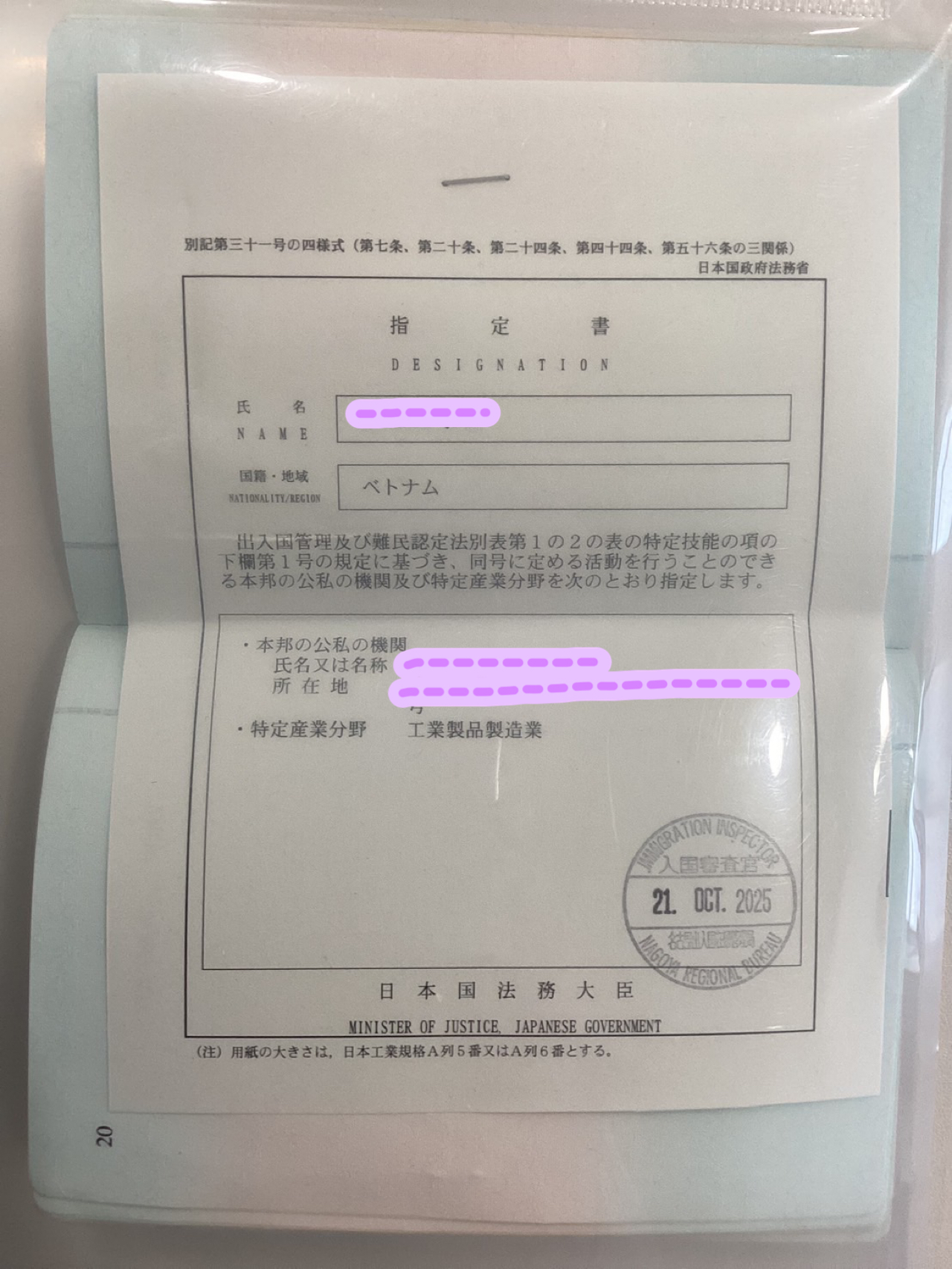 2025.10.27 お知らせ 特定技能1号ビザ取得報告! 我拿到了签证 TOKUTEI GINO Có được Memperoleh Visa 2025.10.21 ベトナム人男性 特定技能1号ビザ(工業製品製造業)取得しました。