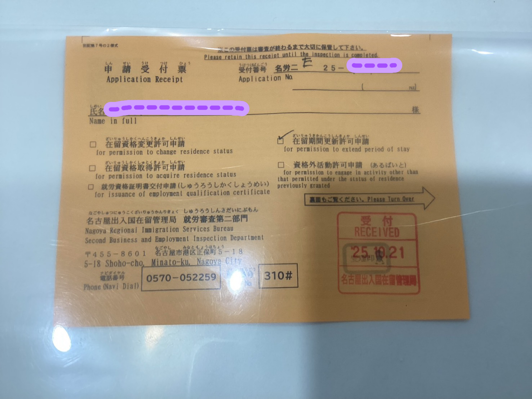 10月21日(PM)、在留期間更新許可申請を名古屋出入国在留管理局へ申請しました。(ベトナム人男性1名)