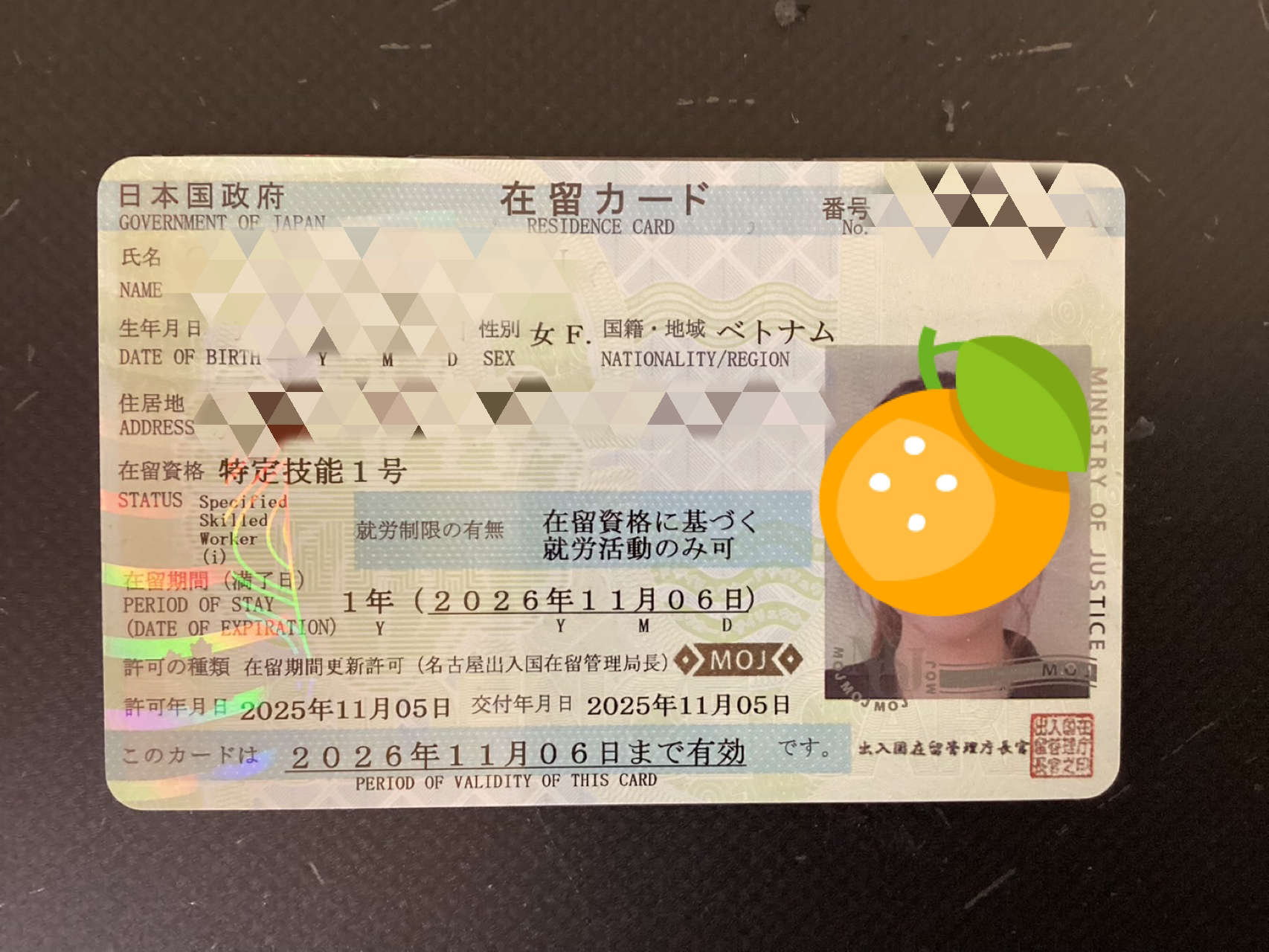 2025.11.06 お知らせ 特定技能1号ビザ取得報告! 我拿到了签证 TOKUTEI GINO Có được Memperoleh Visa 2025.11.5 ベトナム人女性 特定技能1号ビザ(飲食料品製造業)更新しました。