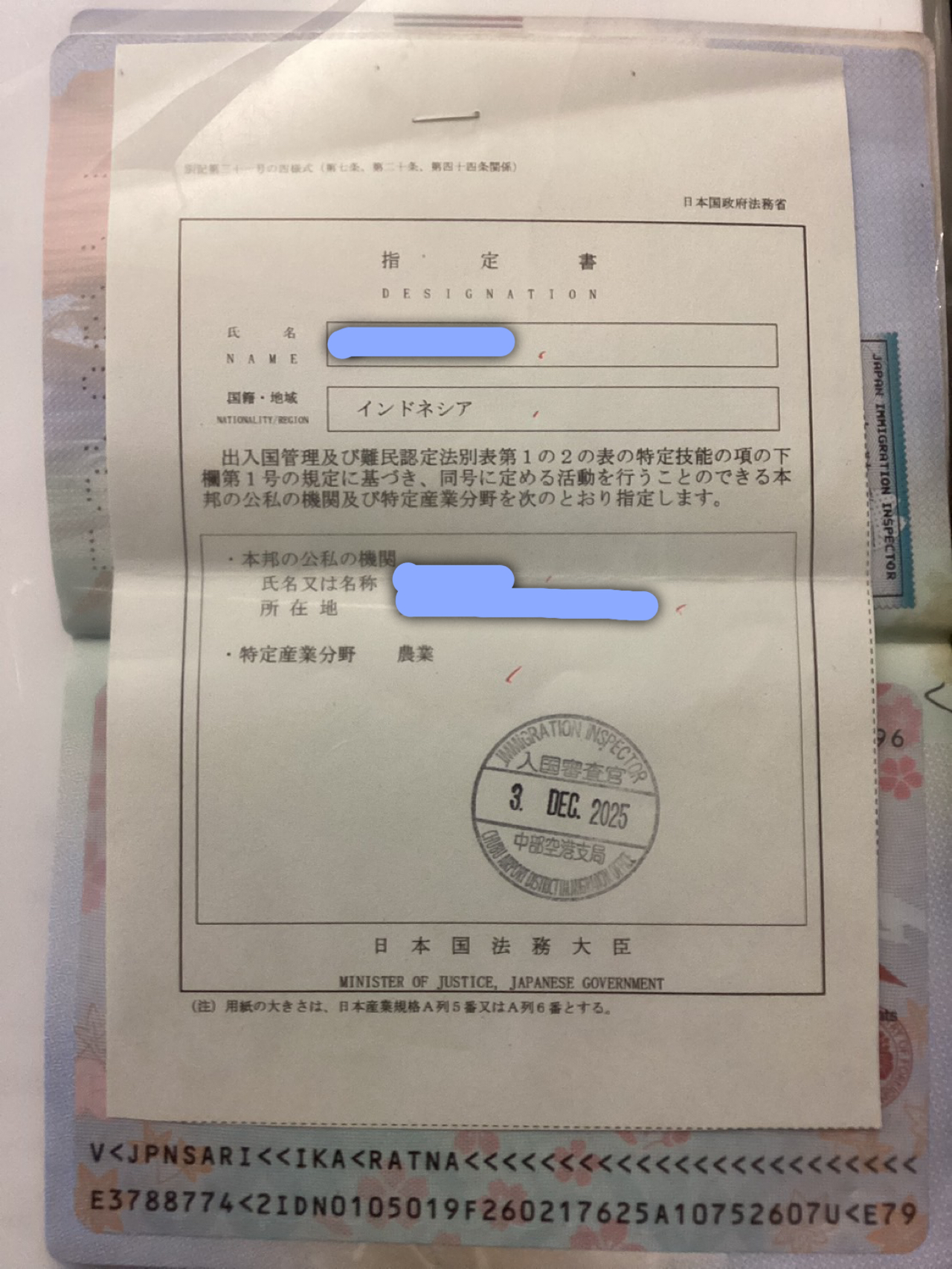 2025.12.12 お知らせ 特定技能1号ビザ取得報告! 我拿到了签证 TOKUTEI GINO Có được Memperoleh Visa 2025.12.3 インドネシア人女性 特定技能1号ビザ(農業)取得しました。