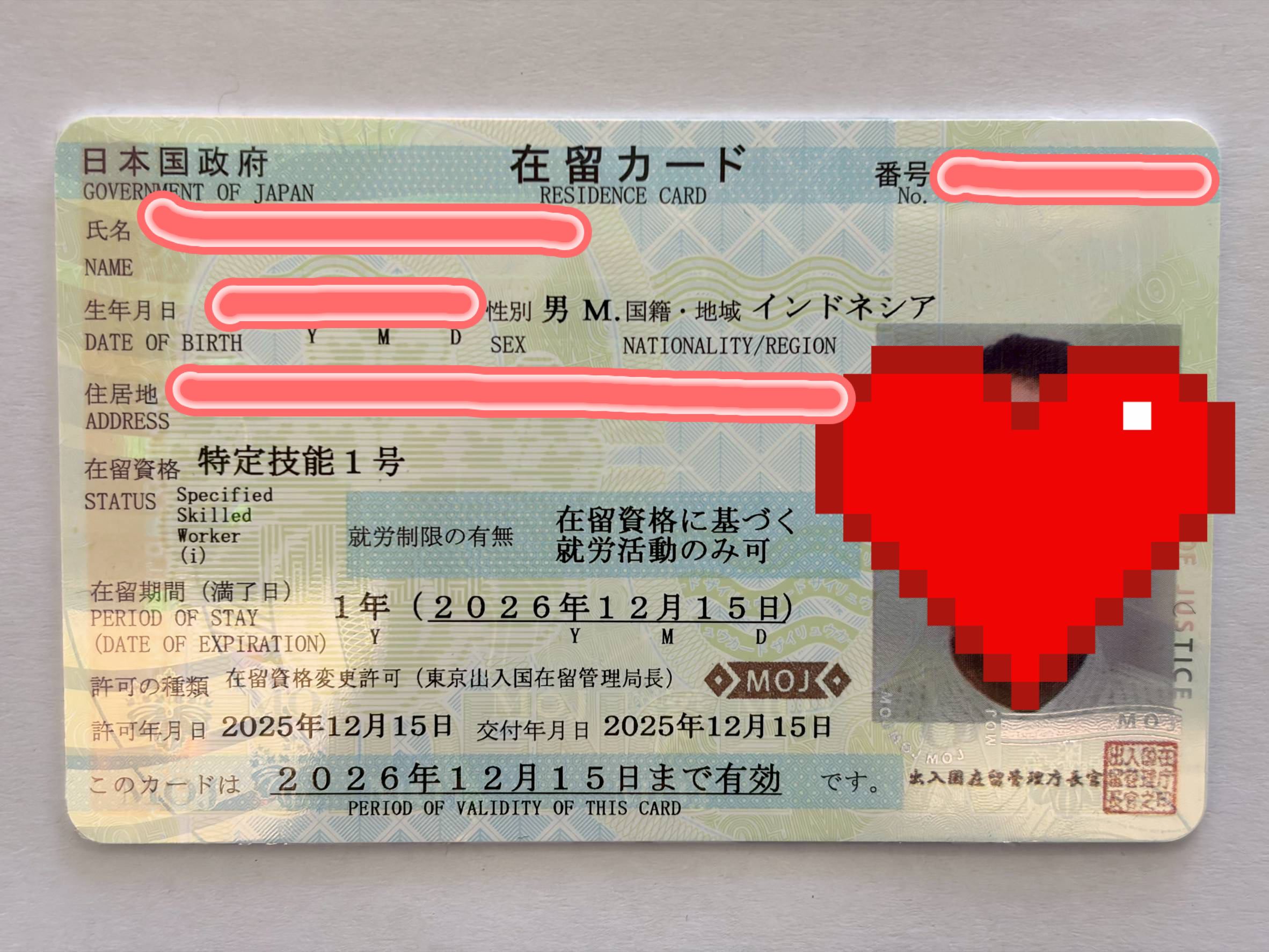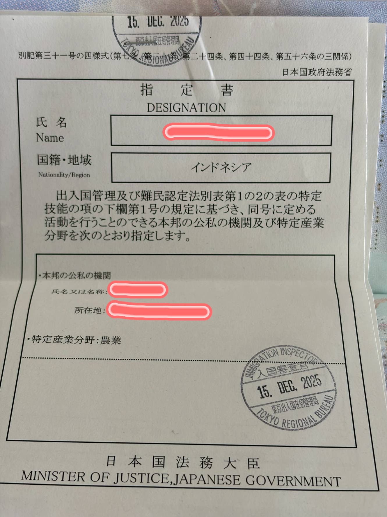 2025.12.29 お知らせ 特定技能1号ビザ取得報告! 我拿到了签证 TOKUTEI GINO Có được Memperoleh Visa 2025.12.15 インドネシア人男性 特定技能1号ビザ(農業)取得しました。