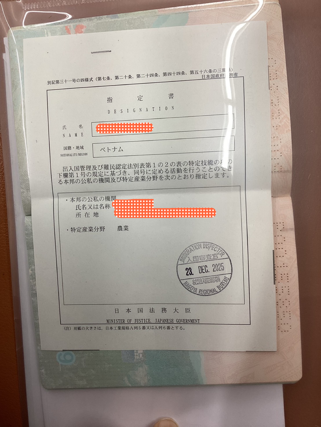 2026.01.15 お知らせ 特定技能1号ビザ取得報告! 我拿到了签证 TOKUTEI GINO Có được Memperoleh Visa 2025.12.23 ベトナム人女性 特定技能1号ビザ(農業)取得しました。