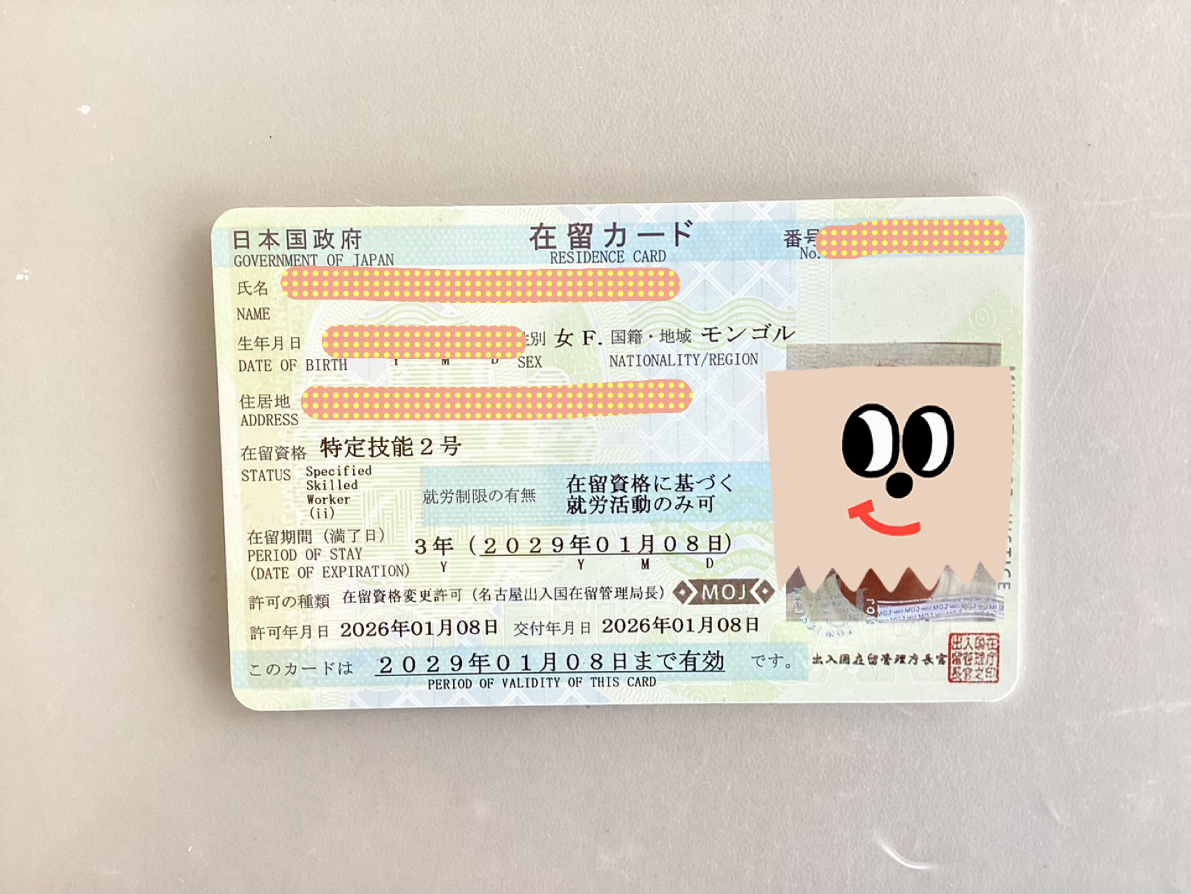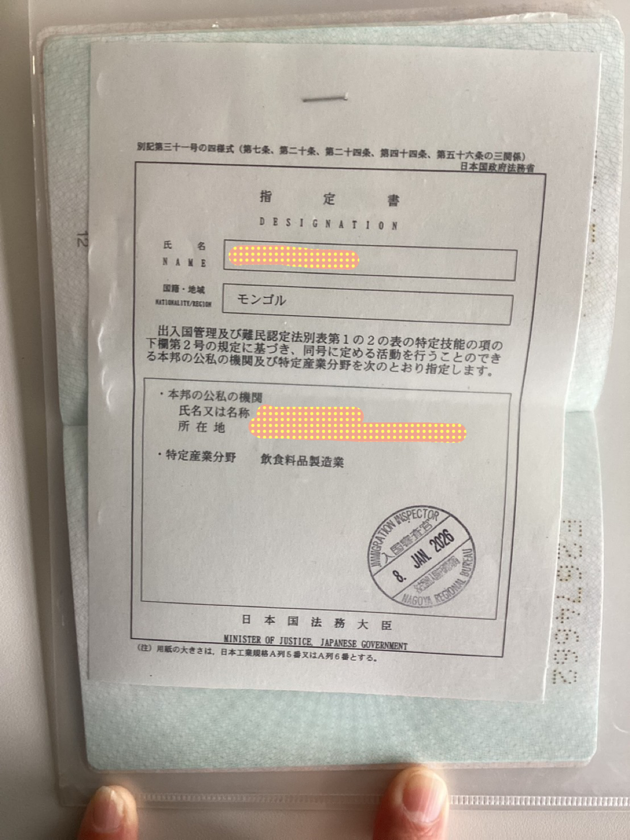 2026.01.26 お知らせ 特定技能2号ビザ取得報告! 我拿到了签证 TOKUTEI GINO Có được Memperoleh Visa 2026.1.8 モンゴル人女性 特定技能2号ビザ(飲食料品製造業)取得しました。