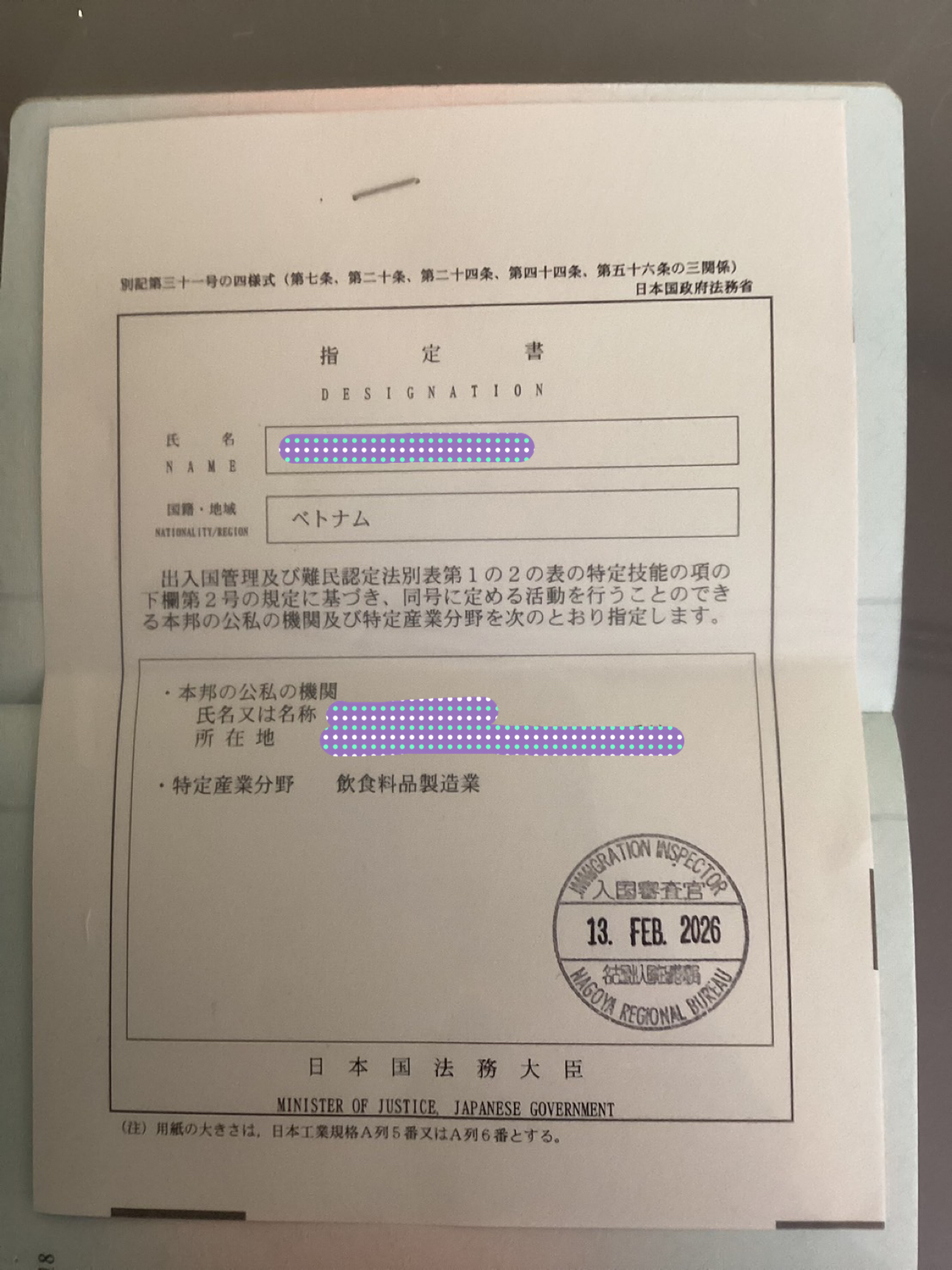 特定技能2号ビザ(飲食料品製造業)取得しました。