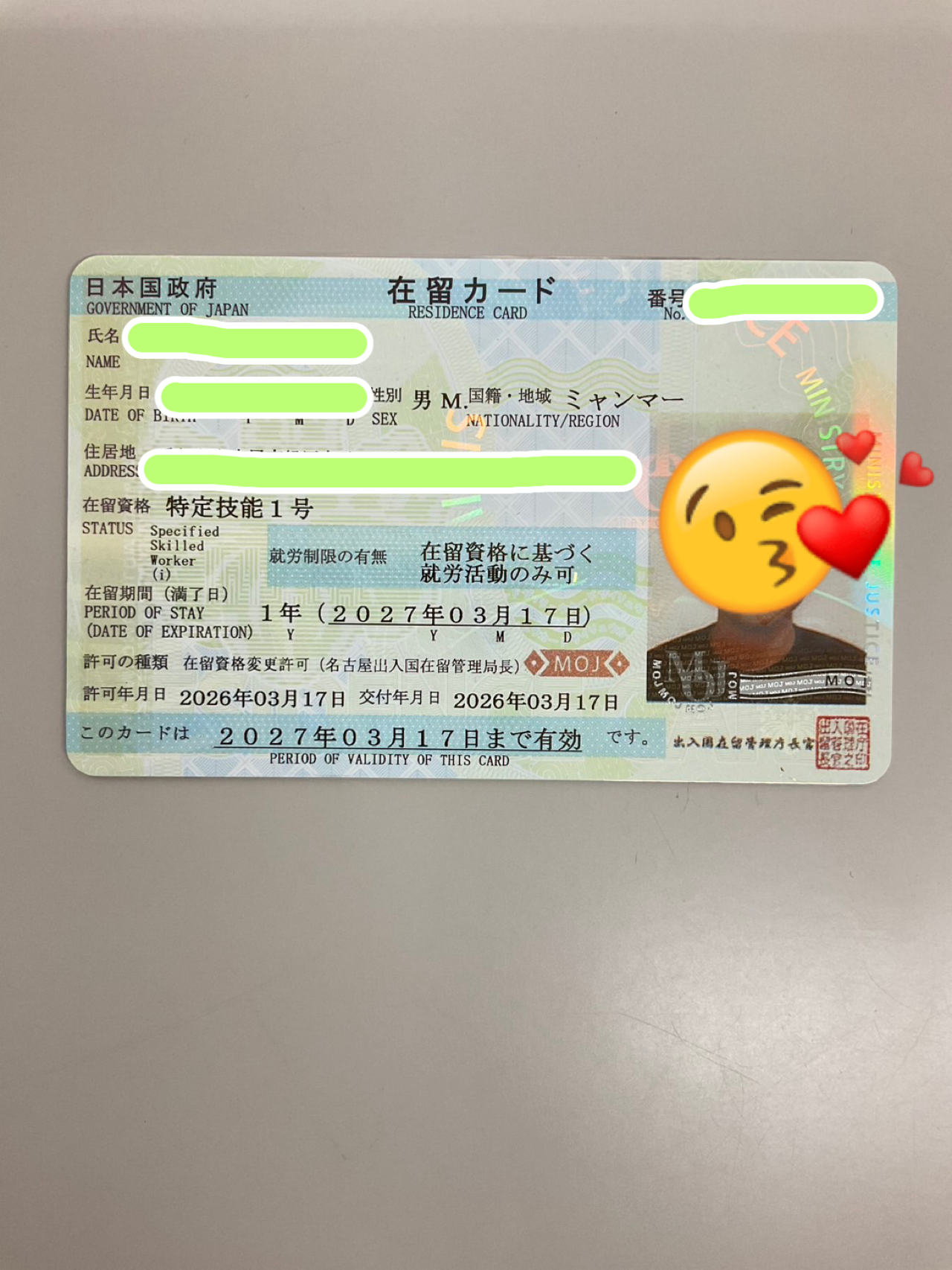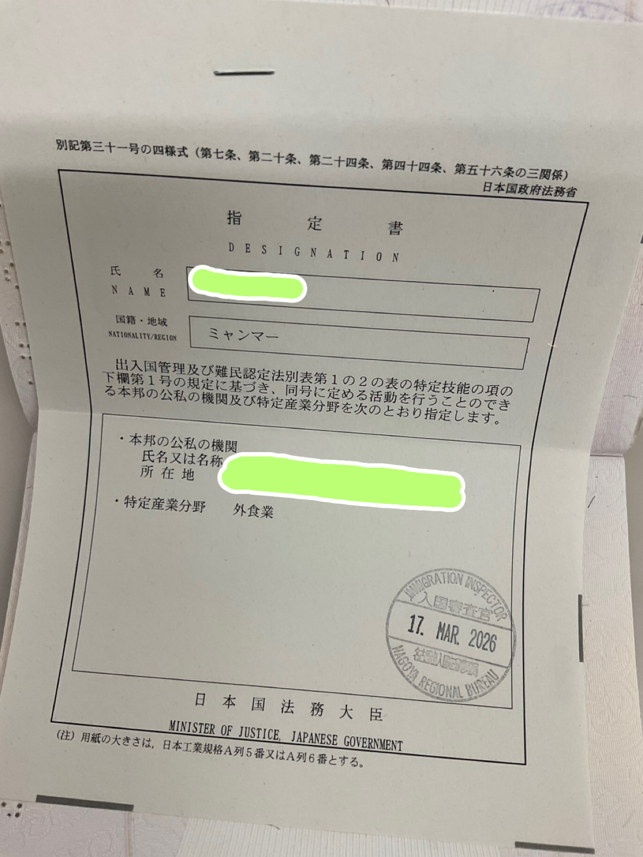 2026.03.24 お知らせ 特定技能1号ビザ取得報告! 我拿到了签证 TOKUTEI GINO Có được Memperoleh Visa 2026.3.17 ミャンマー人男性 特定技能1号ビザ(外食業)取得しました。