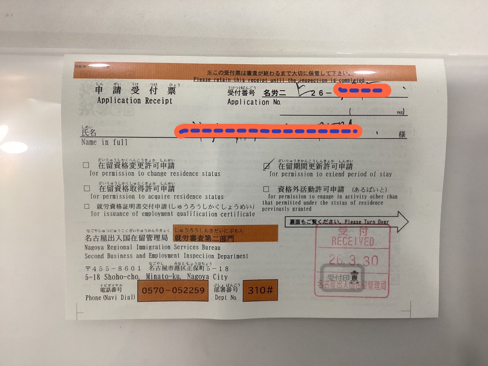 2026年3月30日(PM)、在留期間更新許可申請を名古屋入管へ申請しました!